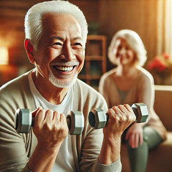간단히 의자에 앉았다 일어나는 동작을 10회 반복하거나, 12kg의 가벼운 아령을 이용해 팔을 천천히 들었다 내리는 운동, 탄력 밴드를 사용해 팔과 다리를 늘리는 운동이 매우 효과적입니다.